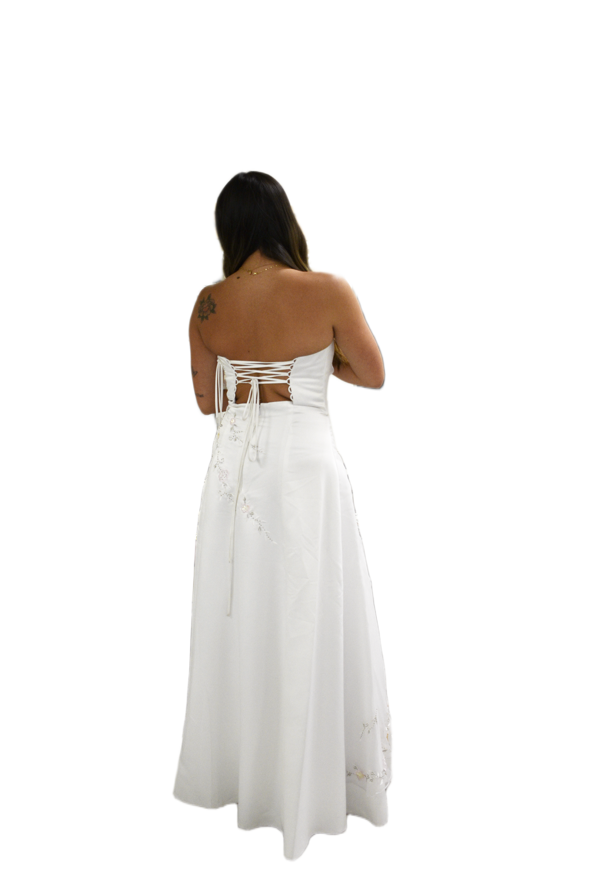 This timeless strapless A-line wedding gown features a graceful lace-up back for a custom fit and subtle floral embroidery that cascades diagonally across the bodice and skirt. The flowing satin finish creates a flattering silhouette, perfect for brides seeking a blend of classic elegance and modern romance. Ideal for garden, beach, or indoor ceremonies, this dress offers both comfort and style for your special day.